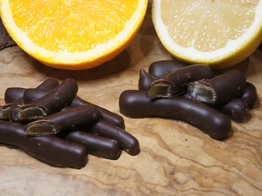 なかでも、オレンジピールとレモンピールを詰め合わせたピールセットは、ブランドを象徴する逸品。 果皮をシロップ漬けし、ゆっくりと乾燥させた後、香り高いダークチョコレートでコーティング。 オレンジの甘みと、レモンの酸味がビターショコラの深い味わいと重なり合います。
