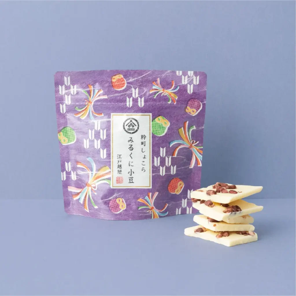 江戸の粋を現代に伝える「江戸越屋」は、日本のおいしいものと洗練された和のデザインを組み合わせた、お菓子のギフトを展開するブランドです。代表的な商品の「粋町しょこら みるくに小豆」は、しっかりと小豆の風味が感じられる、シリーズで1番の人気を誇る一品です。