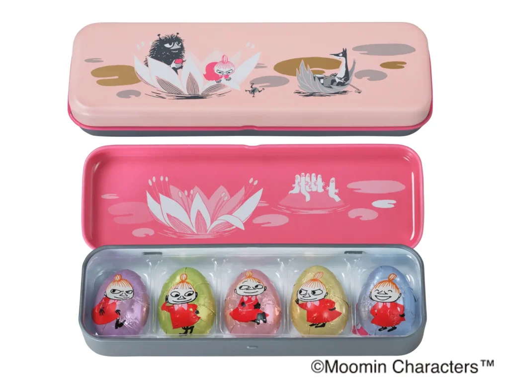 ムーミンの世界観と「メリーチョコレート」の上質な味わいが出会った、心ときめくバレンタイン限定シリーズ。「リトルミイの水遊び」は、お花や草に乗って水面を散策するリトルミイたちを描いた、細長いデザイン缶が印象的な一品です。