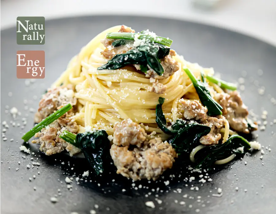 自家製サルシッチャと旬の縮ほうれん草を添えた、イタリア産グルテンフリーパスタのオイル仕立て。