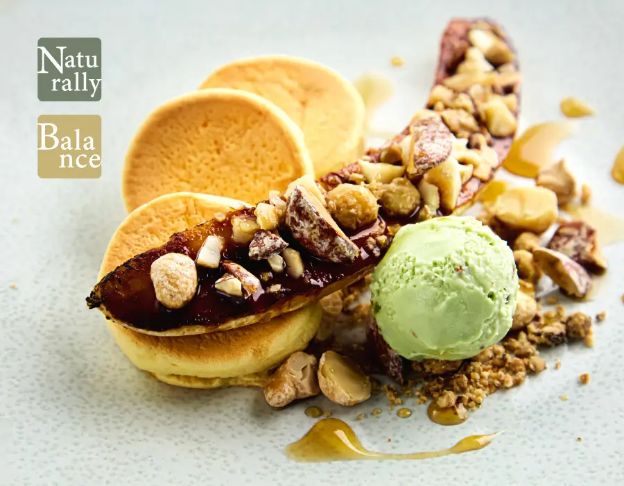 豆乳と米粉でふんわりと焼き上げた、グルテンフリーのパンケーキ。バナナとナッツの香ばしさ、ピスタチオアイスの豊かなコクを添えました。