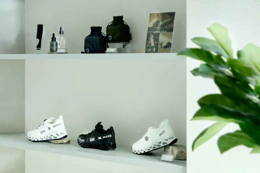 店内では、ameplaが自社開発する 体幹ダイエットスニーカー「バランスコアスニーカーシリーズ」やヘアケアアイテムなどを一部展示・ご紹介しています。