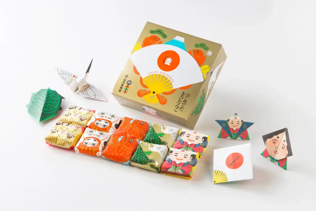 「めでたきびだんご10個入」は、日本の伝統的な縁起物、鶴・亀・鯛・七福神などをあしらった