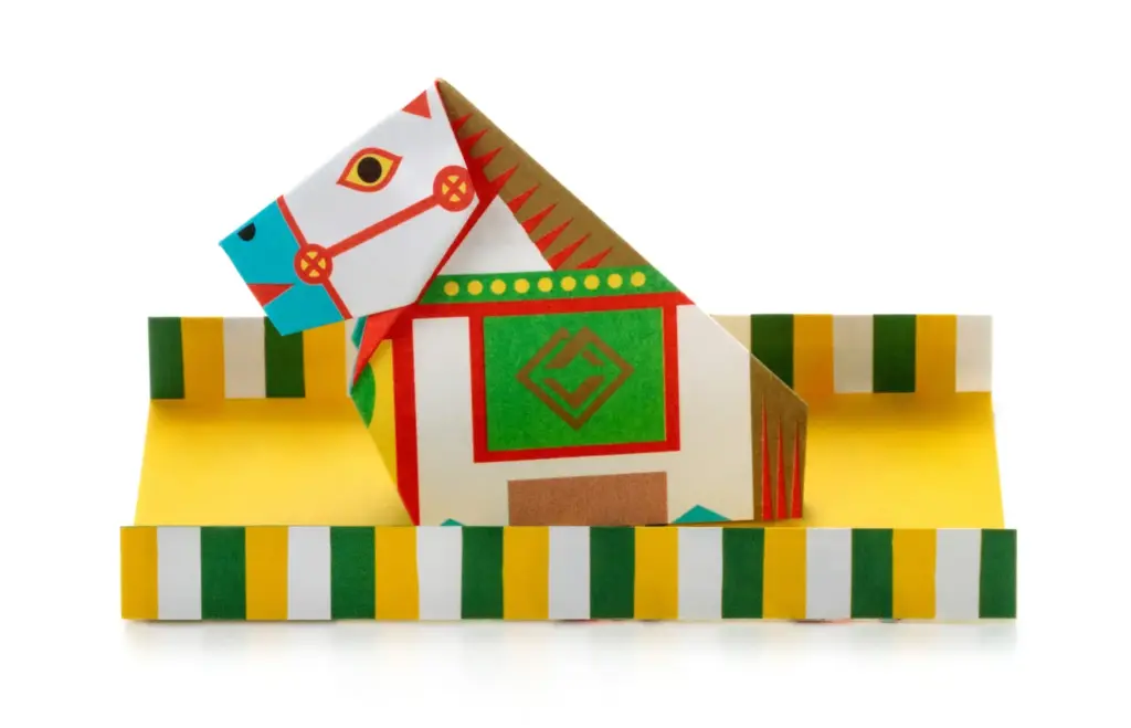 箱を開けると、来年の干支「午」や鶴・亀・福助のめでたい折り紙が入っており、飾って楽しめます。