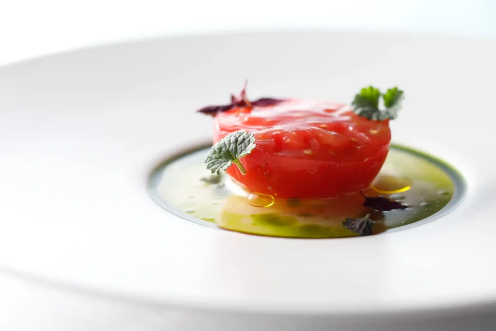 かつては身近な存在であった野草・カキドオシに改めて焦点を当てたひと皿。東京の里山に自生するカキドオシの爽やかな香りを生かし、プラントベースのカプレーゼとして表現しています。カキドオシで香り付けしたトマトのコンポートと、豆乳で作ったリコッタチーズが、野草ならではの個性を引き立てます。食の未来は、実は私たちの足元に眠っているかもしれない——そんな想いを込めた料理です。