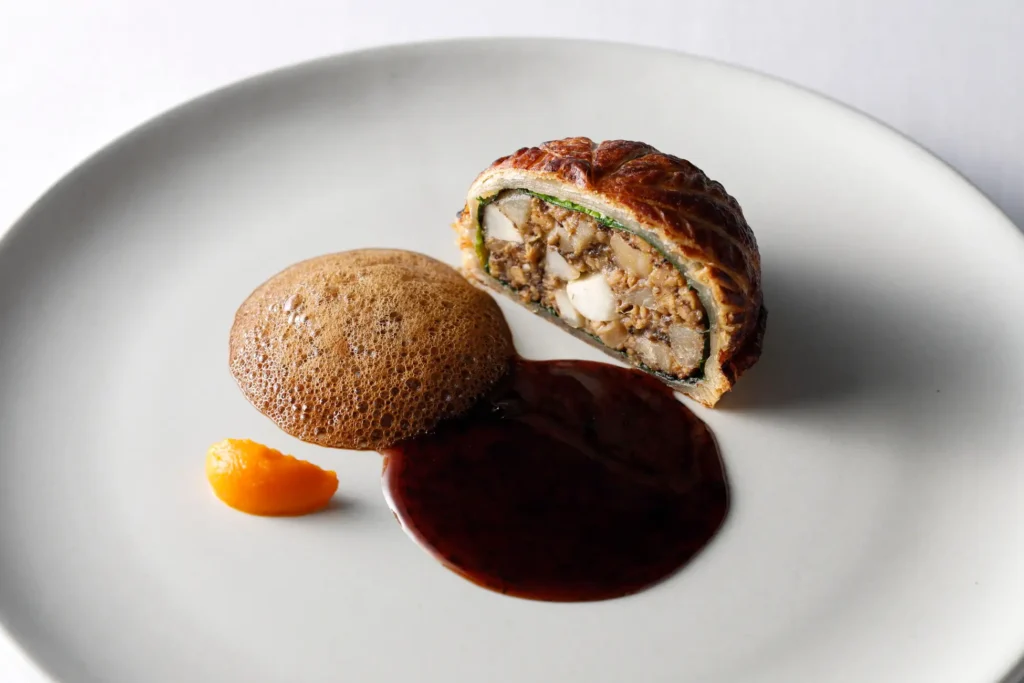 単なるヴィーガン料理にとどまらず、日本の伝統文化と、野菜の端材を再利用する循環の思想から生まれたひと皿。「食の未来への新たな可能性」をテーマに再構築しています。根菜や大豆、キノコ類を使ったプラントベースのパテをパイ生地で包み焼きにし、醤油と端材から作ったサステナブルなベースのソースに、茸とエスプレッソの泡を添えて、香りの余韻を生み出しています。