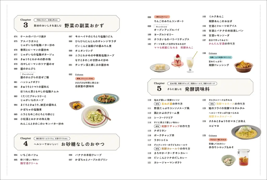 はじめに/本書について/Chapter1:手軽にできる!基本の発酵調味料/Chapter2:子どもの大人も大好き!メインおかず/Chapter3:素材のおいしさを楽しむ野菜の副菜おかず/Chapter4:ヘルシーでおいしい!お砂糖なしのおやつ/Chatpter5:さらに楽しむ発酵調味料/スペシャルインタビュー:とけいじ千絵