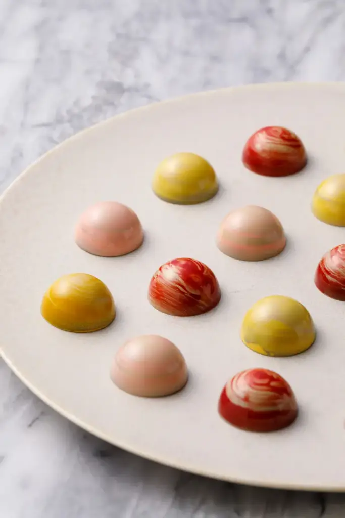 動物性食材不使用。“ヴィーガンでも、美味しさに妥協しない”を合言葉に生まれたショコラシリーズ。フランス・リノラ社のヴィーガンチョコレートを使用し、ガナッシュにはアーモンドミルクを採用。さらに、フルーツ生産者のトレーサビリティが明確で、アグロエコロジー(生態系に配慮した農業)を推進する生産者のフルーツピューレを組み合わせました。3種類のフレーバーは、産地の個性がきわだつ華やかなラインアップです。