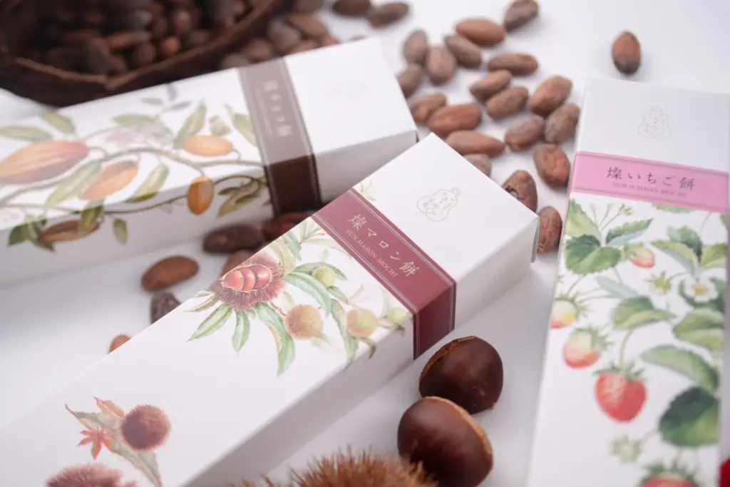 「燦マロン餅」「燦いちご餅」「燦チョコ餅」は、いちご・カカオ・栗といった太陽の光で育つ“太陽の実”に着目し、“あん”の奥深さを主役に据えたシリーズです。やわらかな餅と素材の持ち味をいかした“あん”をひと粒に閉じ込め、〈“あん”を味わう新しいかたち〉として仕立てました。手描きの線と色彩で太陽の恵みを表したパッケージは、世代や国を問わず手に取りやすい温もりを感じていただけるよう工夫しています。