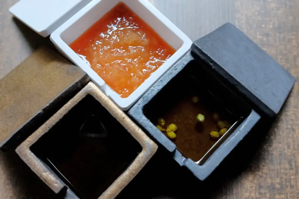 各自お好みのスープに仕上げていただけるよう、地元産<朝倉山椒>オイル、すりおろし梨ポン酢、発酵唐辛子など、3種類の味変アイテムを提供します。 ※グルテンフリー対応時には別途ハーブスパイスを用意