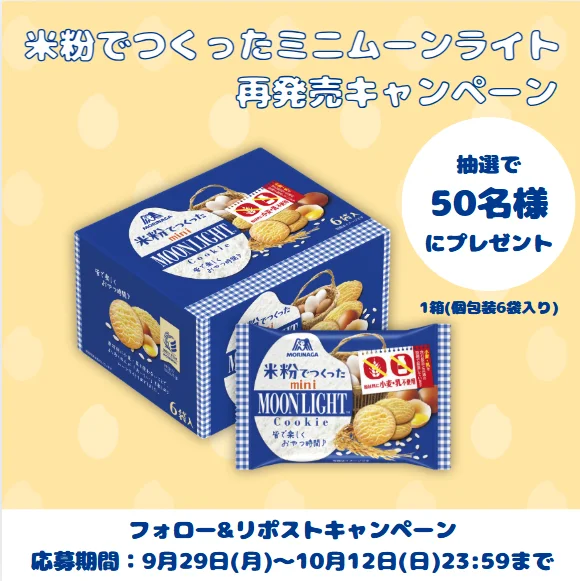 X(旧ツイッター)で森永アレルギーLabo(@morinagaallergy)をフォローして、該当のポストをリポストで抽選で20名様、メッセージ付きの引用ポストで抽選で30名様に「米粉でつくったミニムーンライト」1箱(個包装6袋入り)が当たるキャンペーンを実施いたします。