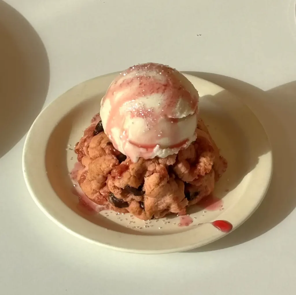 チューイーな食感の生クッキーの中にはたっぷりのチョコソースが入っています。トッピングにはミルクアイスとベリーシロップを使用しており、一口食べるとアメリカンな味わいが口いっぱいに広がります。