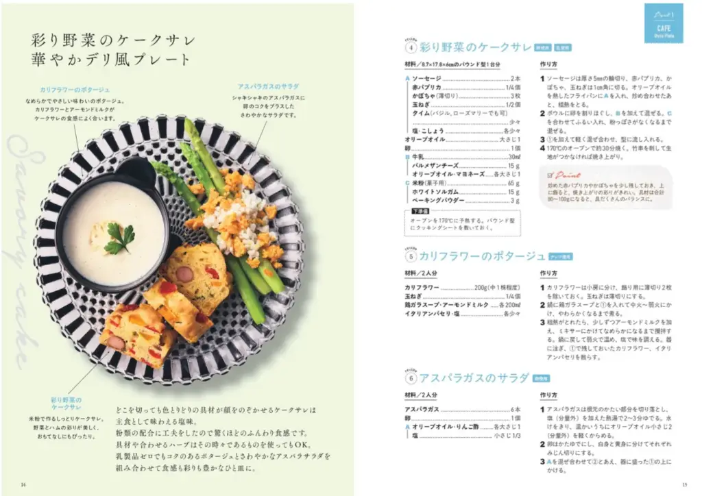 彩り野菜のケークサレをメインにしたデリ風プレート。ふんわり食感のケークサレはカリフラワーのスープとベストマッチ。