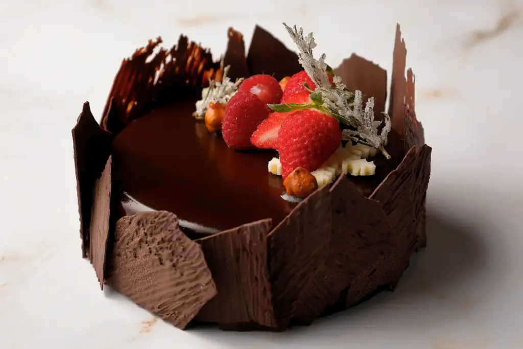 ミロワールショコラはカカオの生地にキャラメリゼしたヘーゼルナッツとなめらかなババロワを合わせた、濃厚なチョコレートケーキ。アールグレイの爽やかな香りと滑らかな食感がナッティな風味を引き立てる、リッチな味わいがお好きな方におすすめです。