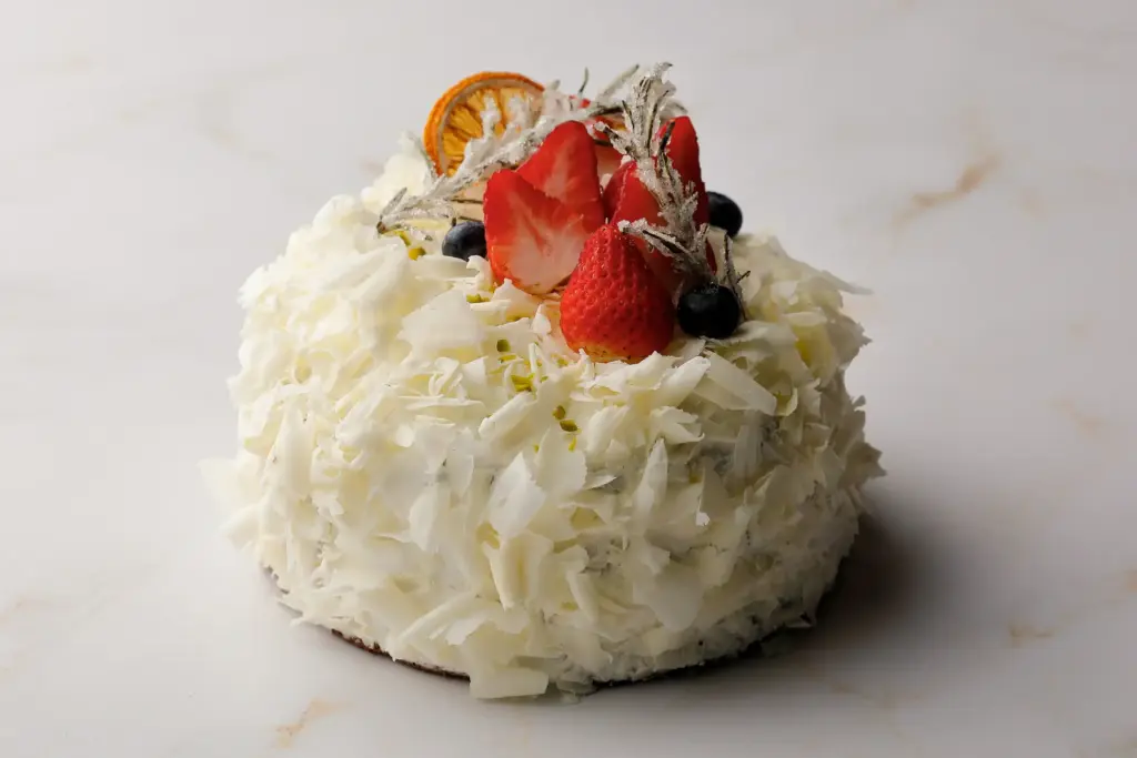 ホワイトフォレストはキルシュ(さくらんぼ酒)を使った定番のブラックフォレストに苺を使い、ホワイトチョコで雪化粧のように仕上げました。さっぱりとした甘さとフルーティーな香りが特徴で、華やかなクリスマスを楽しみたい方にぴったりです。