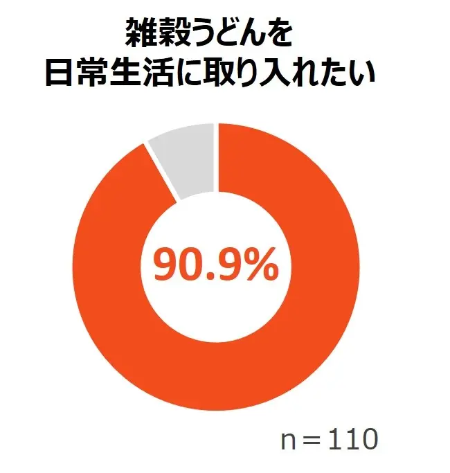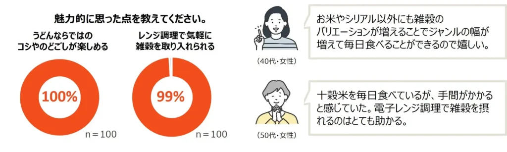 30~60代の男女110名を対象に、雑穀に対するイメージ調査および本商品の試食調査を実施しました。雑穀に対しては、過半数以上の方が「健康的なイメージがある」と好意的に受け止めている一方で、「日常の食生活に取り入れにくい」「何を選べばよいかわからない」といったハードルもありました。本商品は、そんな「雑穀」という素材をより手軽に取り入れる選択肢の一つとして、90.9%の方が、「日常生活に取り入れたい」と回答しました。その理由として、「うどんならではのコシやのどごしを楽しめる」「レンジ調理で気軽に雑穀を取り入れられる」といった声が寄せられました。うどんならではのおいしさを我慢することなく、手軽に日常に雑穀を取り入れられる点を高く評価いただいています。