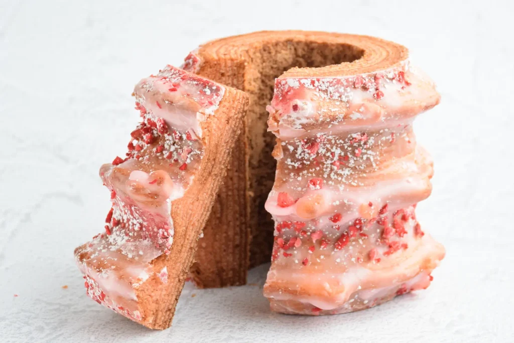 いちごを贅沢にあしらった華やかなパッケージ。箱を開けた瞬間に現れるのは、目を奪われるピンク色のバウムクーヘン。思わず写真を撮りたくなる、ギフトにふさわしい佇まいです。