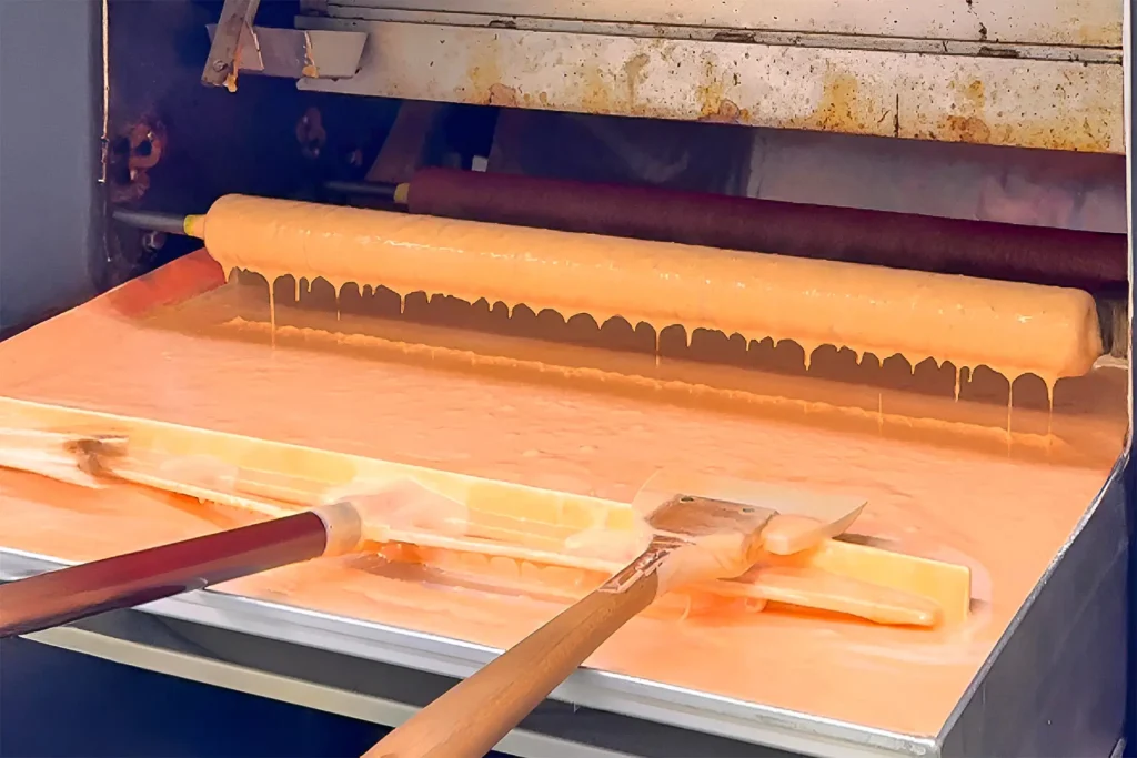 回転する芯棒に生地を巻き付けた後は、成形コームで丁寧に山型に整えます。