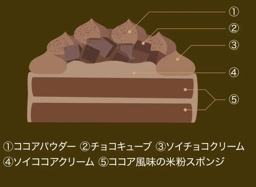 ココア風味の米粉スポンジに豆乳由来の「ソイチョコクリーム」をサンド。トッピングには、同じく「ソイチョコクリーム」と「ソイココアクリーム」に、くちどけの良いチョコキューブを乗せました。濃厚なチョコレートを存分に楽しみたい方におすすめのチョコレートケーキです。