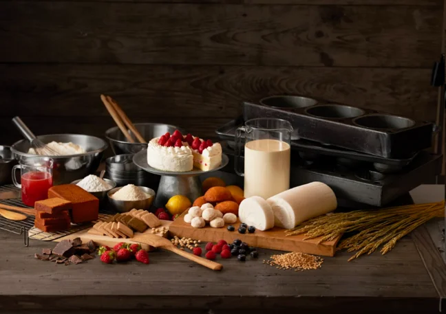 小麦・卵・乳成分を含む食材を使用しないアレルギー対応専用ラインでは、高度な技術力を持つ㈱タカキベーカリーの技術指導のもと、ブランド米として名高い新潟県十日町産魚沼コシヒカリの米粉と、豆乳を使ったケーキを製造しています。