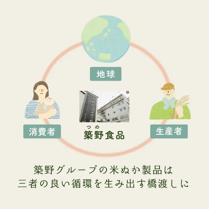 当社は長年、こめ油の原料である米ぬかの成分に着目し、研究を進めてまいりました。精米時に発生する副産物である米ぬかの成分を抽出することで、こめ油だけでなく食品、化学、医療、化粧品等の幅広い分野への高度有効利用をし、米ぬかの100%活用をしています。今後も国内の米ぬかを活用することで地球・生産者・消費者の良い循環の実現を目指していきたいと考えています。