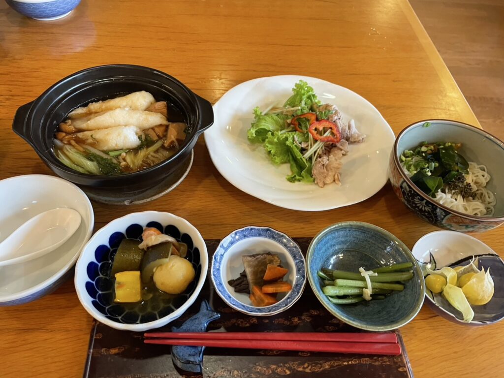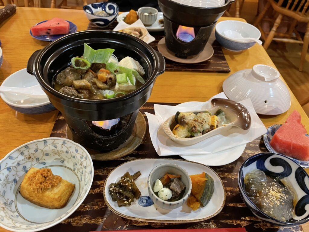 秋田での食事は主に宿で出して頂きました。昨年お世話になった農家さんはラディッシュハウスというペンションも経営されています。昨年食物アレルギーについてやりとりしていたため、卵、魚介類、ナッツ類なしを覚えていて下さって、予約の時点からとてもスムーズ。初日の夕飯は秋田名物手作りのきりたんぽが最高でした。お米のつぶつぶ感があり、鶏とごぼう出汁が良く出て味わい深い。ほおづきは森に生っていたものとのこと。初めてほおづきを食べましたが自然の甘みが優しかったです。毎食色々な味付けで出てくる、近くの川辺で取れる秋田名産「みず」という山菜は病みつきになる歯ごたえです。