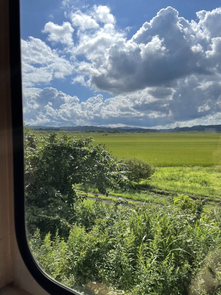 二日目は盛岡を経由してついに秋田へ。どこまでも平野が続き青々とした水田が広がり、その向こうには杉の濃い緑が空に向かって真っすぐと伸びた山々が連なっています。東北の短い夏のなんと美しいことか。また、青い稲穂を眺めていたら、ここで日本の食が支えられているのだなと感謝の気持ちが沸き上がってきました。