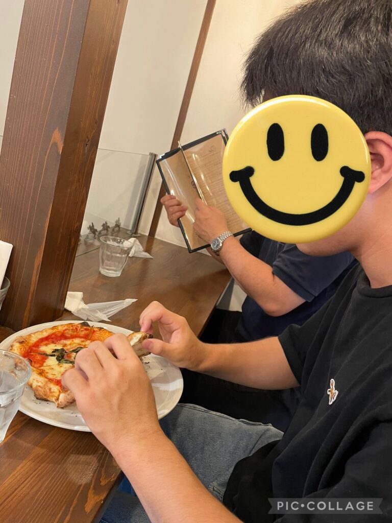 1日目のお昼はピザ屋へ。小麦と乳が食べられるためここはオットのリクエストが通りました。でもいざメニューを見ると、魚介やジェノベーゼソース(松の実)に気を付けないといけないため、食べられるメニューは1つだけでした。それでも大きなピザ1枚を秒で完食。